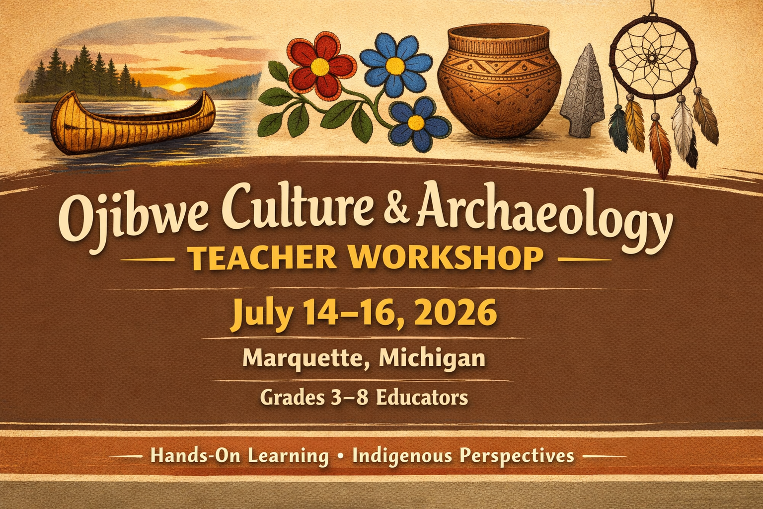 Participants will experience modeled lessons as learners, analyze historic data from authentic archaeological sites, hear from Indigenous presenters, and explore new ways to connect students to museums and archaeological sites. Registration includes curriculum books, an interactive Ojibwe language presentation by Nashke Games, and a cultural presentation by a local Ojibwe educator. One day of the workshop will take place at the Marquette Regional History Center for additional hands-on learning and exhibit exploration.