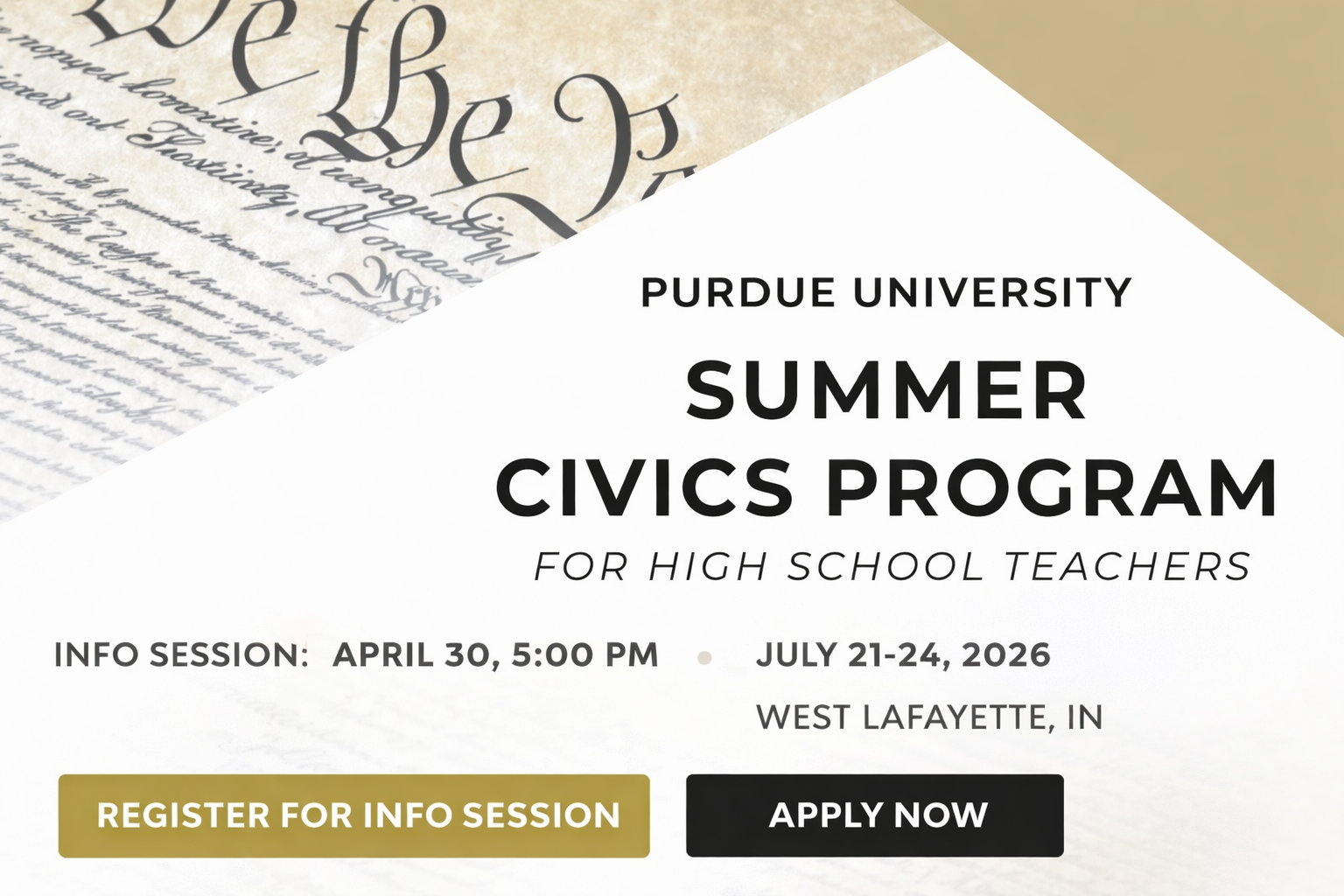 Purdue University’s Summer Civics Program is a four-day professional learning opportunity designed for high school educators who want to strengthen civic literacy, deepen their understanding of foundational American principles, and explore effective strategies for civic education in the classroom. The program is connected to Purdue’s civics-focused work through the Cornerstone Institute for Civic Thought and the Program on American Institutional Renewal. Jesse Crosson serves as a co-director of PAIR, and Sebastian Graham is an assistant director in Purdue’s Institute for Civic Thought.